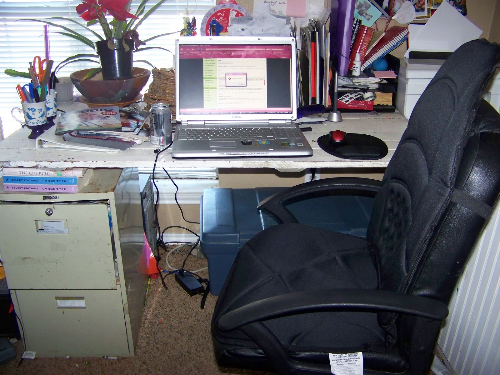 Throw away all but the very best kid drawings. Post the best kid drawings on the side of my filing cabinet with magnets. No space goes unused in my office! Take the old drawings that I had to take off the filing cabinet to make room for the new pictures and put them in a keepsake box. Move all my sketchbooks to my art table, which is more cluttered than my desk. Mental note: Clean art table. Throw away junk mail and file bills or letters from my military hubby. Shelve the reference books, art books and kids books. Put extra pens in jars and other office supplies back in my desk drawers for the 100th time this week. (I swear my kids use my office supplies more than I do!) Find a bill that I forgot to pay and scramble to the mailbox. Come back and collect the Diet Coke cans for the recycling bin. Take the empty cereal bowls and yogurt cups to the kitchen. Eating while working is productive, right? Ahh. That's better.