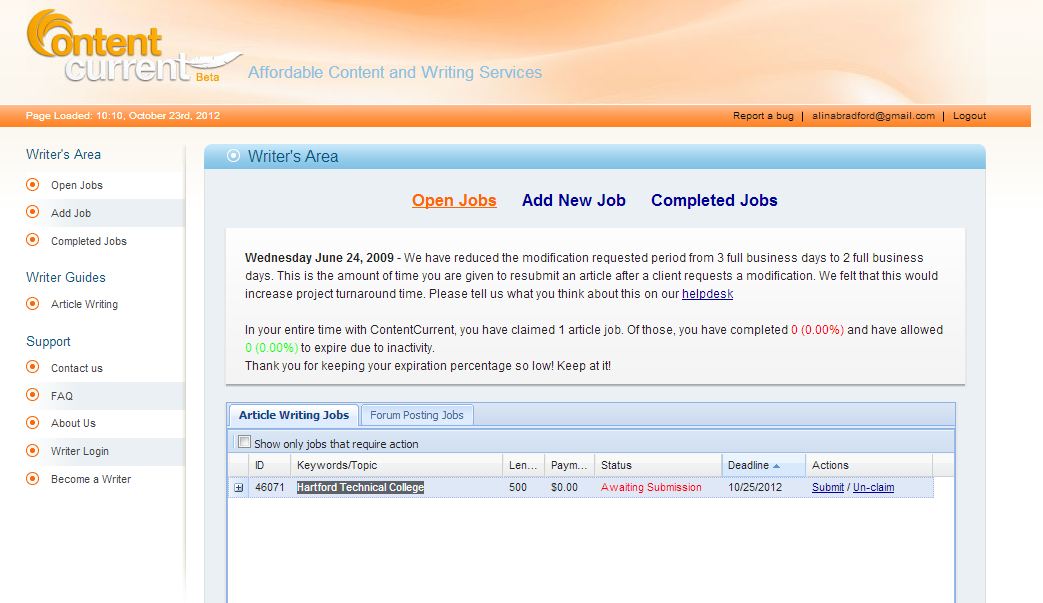 I was alerted to ContentCurrent by a fellow writer in a Facebook group I'm a member of, so I checked it out. According to their site, "As a Content Current writer you will be able to pick the writing tasks that you like and submit them through our easy-to-use interface. There are thousands of writing tasks waiting to be completed on ContentCurrent right now."